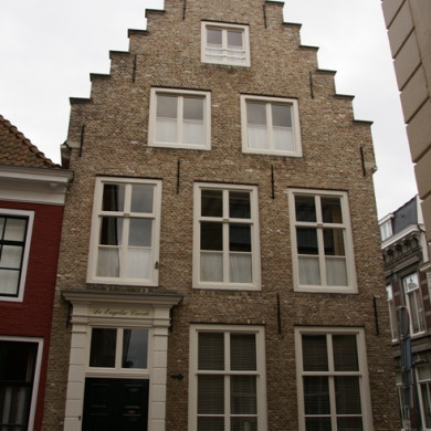 Eenvoudig huis met gecemente lijstgevels op de hoek van de Engelsestraat.