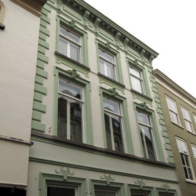 Huis met witgeverfde lijstgevel met kalkstenen banden en sierankers: 1612. Oorspronkelijk de Beurs.