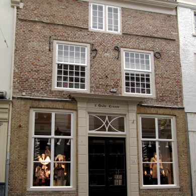 Huis met witgeverfde lijstgevel, sierankers en kroonlijst op kleine voluutvormige consoles. XVII A.