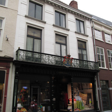 Winkelpand, bestaande uit waarschijnlijk 16e eeuws, met twee tongewelven onderkelderd voorhuis met verdieping onder met oud-hollandse pannen gedekt zadeldak met schild aan straatzijde en tegen puntgevel met vlechtingen aan achterzijde en een vroeg 17e eeuws met twee tongewelven onderkelderd achterhuis met verdieping onder met kruispannen gedekt zadeldak met schild. Voor- en achterhuis hebben eiken moer- en kinderbalklagen. Kap van voorhuis bestaande uit tweejukkige schaargebinten met nokgebint en eiken gordingen, kap van achterhuis bestaande uit een eenjukkig schaargebint. In 1899 is het pand in- en uitwendig verbouwd door de arch. C.P.van Genkt. De voorgevel heeft een hardstenen plint, een houten winkelpui in neo-renaissance vormen met in het midden een inpandige winkeldeur, een rijk bewerkt smeedijzeren balkon en drie openslaande deuren met bovenlichten op de verdieping, drie tweedelige draairamen op zolderhoogte, een witte bepleistering met getrokken horizontale voegen boven de winkelpui, geprofileerde omlijstingen rond vensters en deuren en is afgesloten met een goot op klossen. In het interieur zijn van belang de uit 1899 daterende winkelbetimmering met bijbehorende toonbanken en de stucwerkplafonds in de winkel en de kamer achter de winkel (gepolychromeerd).