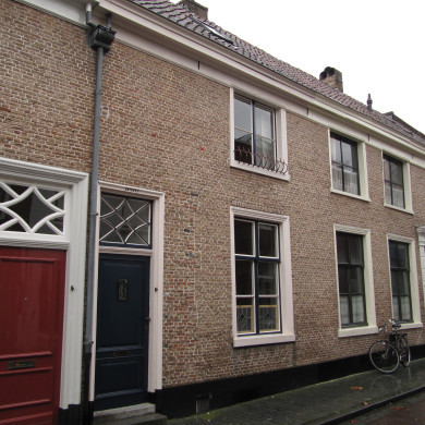 Pand met verdieping onder met pannen gedekt zadeldak, dat doorloopt over het rechter en linker buurpad; gevel afgesloten met later aangebrachte, gepleisterde band met geprofileerd lijstje en geprofileerde goot; twee schuifvensters met gedeeld bovenlicht en geprofileerde omlijsting; deur met gedee