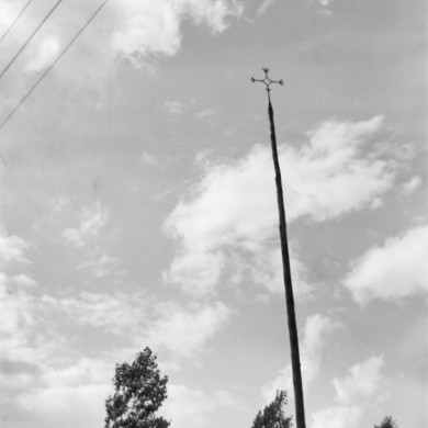 Een ijzeren hagelkruis met leliepunten, op een houten staak.