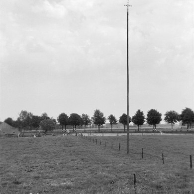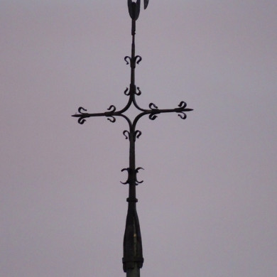 Een ijzeren hagelkruis met bekronende haan op een houten staak.