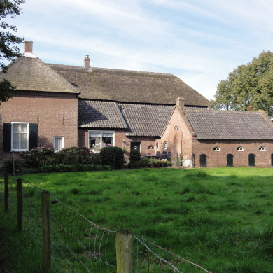 BOERDERIJ, omstreeks 1800 met rieten schilddak en in de voorgevel vensters met luiken en zesruitsschuiframen.