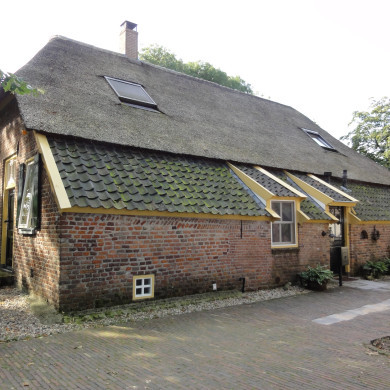 BOERDERIJ, omstreeks 1800 met rieten schilddak en in de voorgevel vensters met luiken en zesruitsschuiframen.
