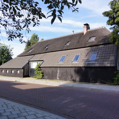 Het woonhuis, dat een lage verdieping en een rieten schilddak heeft, is dwars op de stal gebouwd.