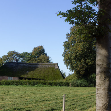 Boerderij van gecombineerd langs- en dwarsdeeltype, met rieten wolfdak, ramen met kleine roedenverdeling en met luiken. Vermoedelijk tweede helft 17e eeuw. In de heerd gesneden sleutelstukken, evenals in de stal.