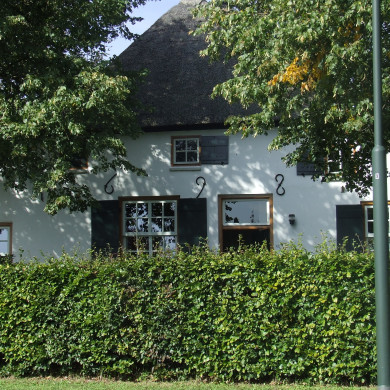 Huis Veebeek. Klassicistisch landhuis met gepleisterde lijstgevels. Empire schuiframen en dakruiter met klok. 1815.