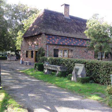 Brabantse langgevelboerderij, 18e eeuw. Schilddak met riet en pannen gedekt. In het woongedeelte vensters met luiken en 25-ruitsschuiframen. In de stal een zijbaander.