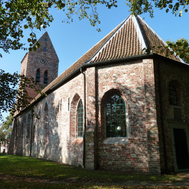 Hervormde Kerk en toren op omgracht kerkhof. Eenbeukig romano-gotisch kerkgebouw met zware nog wel twaalfde eeuwse toren in 1554 verhoogd blijkens gedenksteen. Schip en koorsluiting overwelfd; op het koorgewelf enig schilderwerk; tegen de wand gemetseld sacramentshuisje. In de kerk voorts eenvoudige preekstoel uit 1794 met klankbord en doophek. Orgel op balustrade, in 1704 door Arp Schnitger oorspronkelijk als tweeklaviers instrument gemaakt. In 1785 door A.A. Hinsz verbouwd tot orgel met een klavier. Op de tribune losse zeventiende-eeuwse bank met balusters en gesneden lijsten. Overhuifde rijkgesneden herenbank en minder rijk versierde bank met gesneden kroonlijst en bollen op de hoek. Tegenover de preekstoel vier rijen banken. Onder de tribune gesneden lijst van voormalige banken. Houten offerblok. Twee zeventiende-eeuwse zerken. Klokkenstoel met klok van een anonieme gieter, 1435, diam. 67 cm. Mechanisch torenuurwerk, J.H. Addixks en Zoon, Amsterdam.
