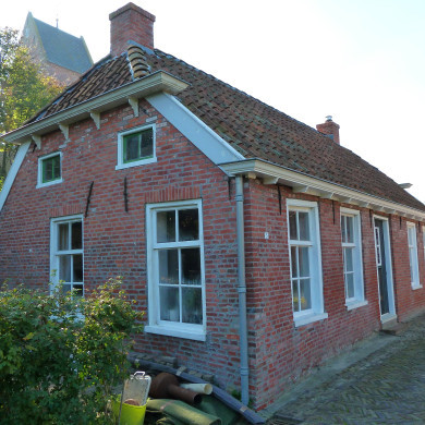 Aan de rondweg rond de kerk staand eenvoudig pand onder schilddak met hoekschoorsteen. Aan een zijde topgevel.