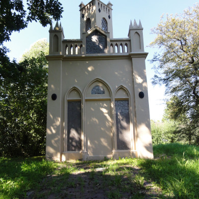 In 1838 ter plaatse van een voormalig kasteel gebouwd huis van de familie van het Lindenhoud. Souterrain en bel-etage. Pannen schilddak. Inwendig tegelkamer. Achter het huis een mausoleum in de vorm van een toren in neogotische stijl, 1861.