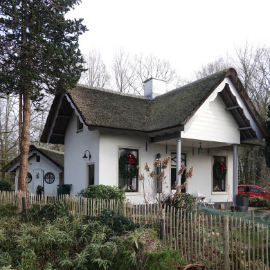 Tolhuis, riet bedaking, gepleisterde muren in midden houten gevel op zuilen; overgeplaatst naar overzijde van de weg.