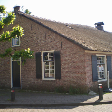 In oorsprong wellicht uit de 18e eeuw daterende boerderij van het Gooise type van de hallehuisgroep onder rieten zadeldak tussen puntgevels met vlechtingen, staafankers en vierruitsvenster in de top (de W.gevel verhoogd); naderhand (19e eeuw ?) verbouwd tot twee woonhuizen met elk een ingang in m
