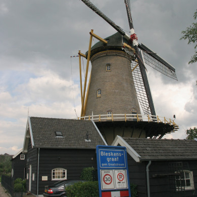 Aan de noordoever van de Alblas, gelegen kapitale HOEVE (midden XIX), waarvan het woongedeelte een omlopend schilddak, aan de rivierzijde een lijstgevel en vensters met vier- zes- en twaalfruitsschuiframen heeft, met luiken.