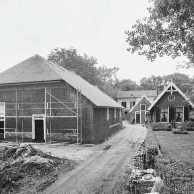 Boerderij, dwarshuis, topgevel met pinakel, fraai ex.17e eeuw, met aangebouwd kookhuis.