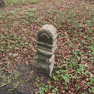 a. Fragment van een laat-gotische, natuurstenen borstwering, versierd met kolonetten en ezelsrugboogjes, waarin toten en wapenschildjes. b. Natuurstenen schamppaal, omstreeks 1600, in renaissance-vormen. c.Natuurstenen schamppaal, gebeeldhouwd in 18e eeuwse vormen.