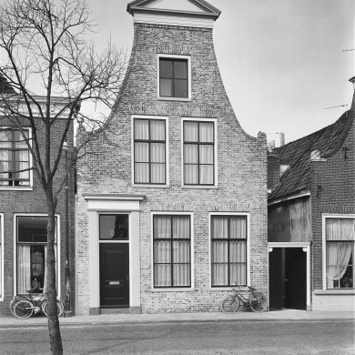 Eenvoudig WOONHUIS welks gevel door rechte kroonlijst is afgesloten. Zesruitsvensters. Topschoorsteen boven voorste dakschild.