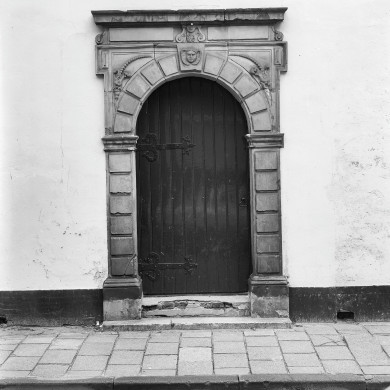 Natuurstenen poortje (XVII A) met gebosseerde pilasters en boog, sluitsteen met gebeeldhouwde kop en in de zwikken ornamentaal werk. Het poortje is ingemetseld in de gevel van een school.