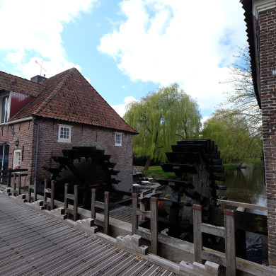 Waterradmolen op de Berkel. Hoog omlopend schilddak en rad aan linker gevel