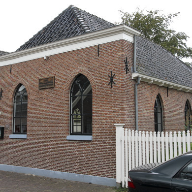 V.m.Synagoge. Eenvoudig gebouwtje met rechte gevel waarin twee spitsboogventers aan de straatzijde.