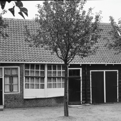 Dwarspand, langs gevel met schuiframen; aansluitend aan de pleinzijde, houten schuurtje, zwart geteerd met witte omrandingen. Zadeldak.