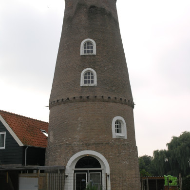 Korenmolen "De Hoop". Hoge ronde stenen bovenkruier met stelling. Fraai van vorm. plm 1849.