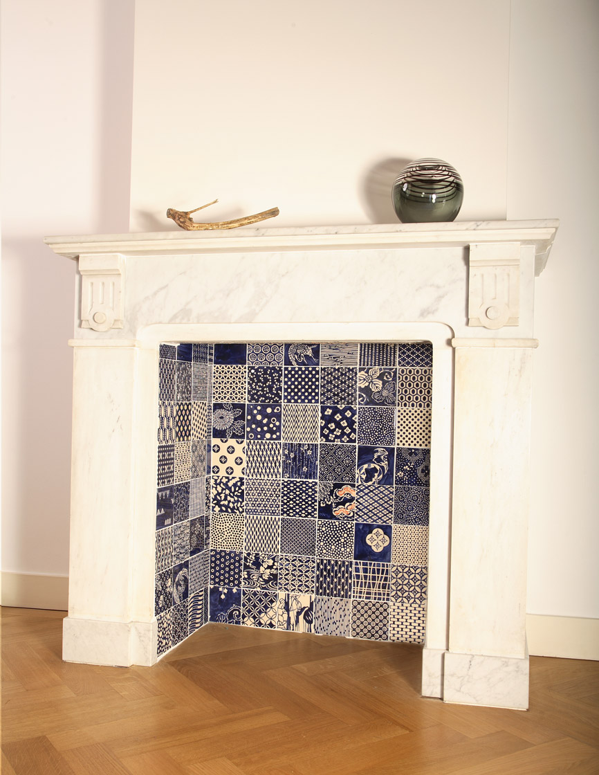 Open afbeelding in gallerijHandgemaakte tegels in de maat van de originele marmeren plint (11 cm) handgeschilderd met Japanse textielmotieven voor een monument Pieterskerkhof, Leiden