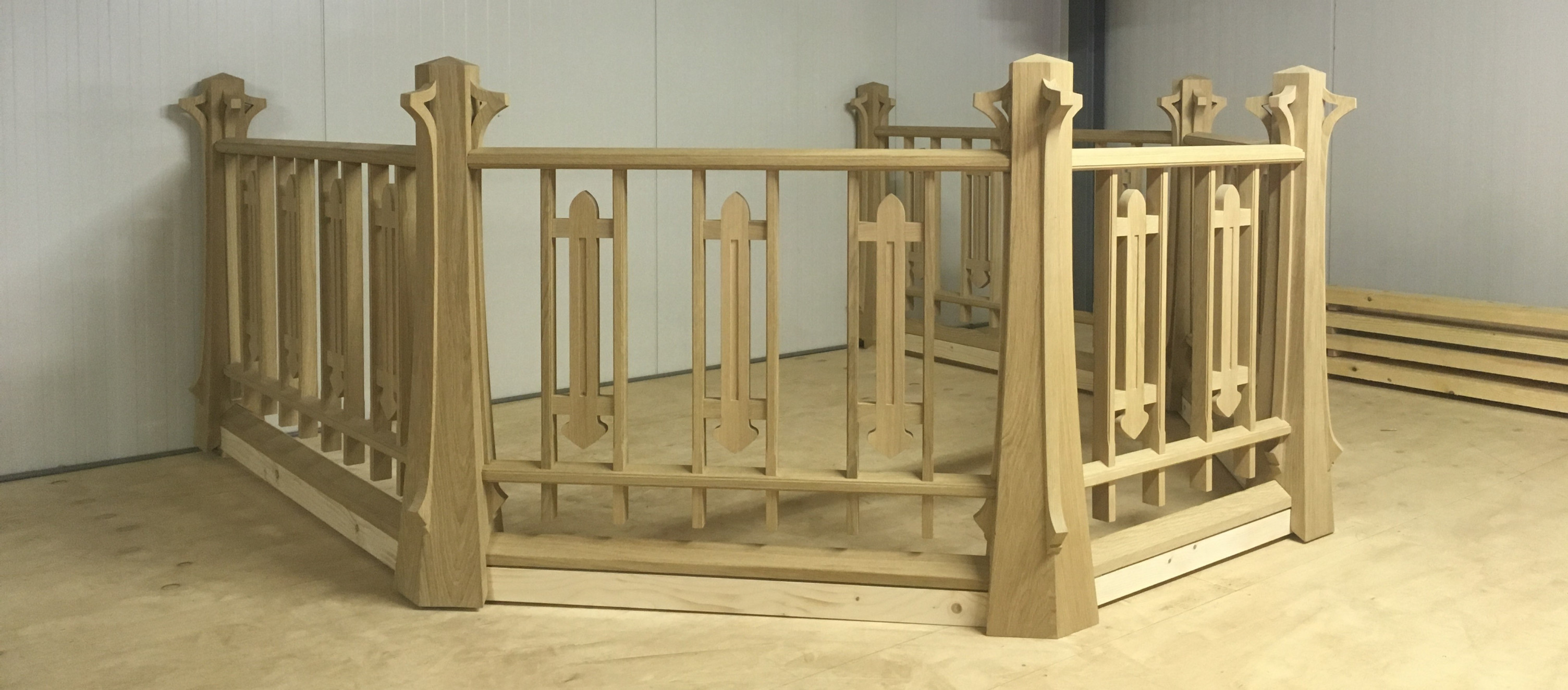 Open afbeelding in gallerijEiken balustrade voor een dakterras, oude balustrade exact nagemaakt en zit helemaal met houtverbindingen in elkaar,32 halfhoutverbindingen en 180 pen en gat verbindingen.
