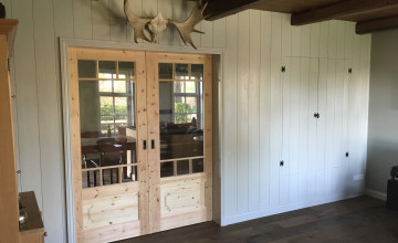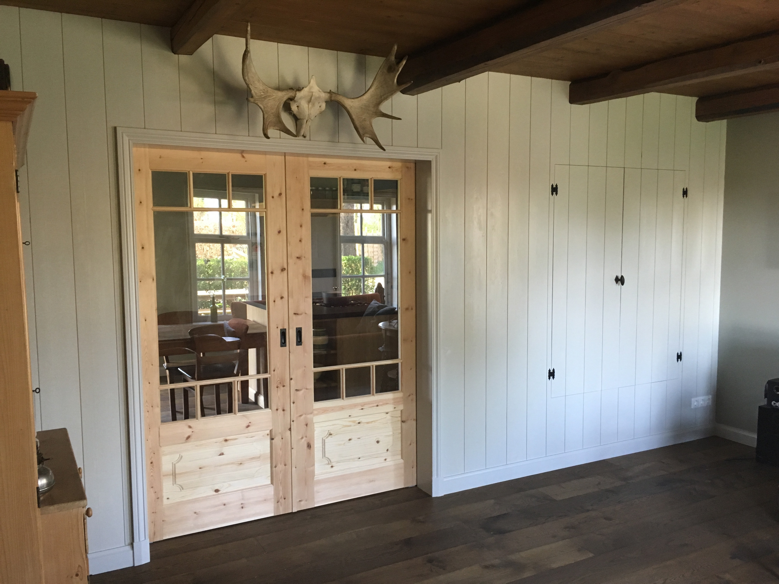 Open afbeelding in gallerijHouten wand met bedstee deuren en schuifdeuren in de zelfde stijl als de andere binnendeuren.
