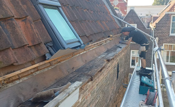 Verschillende restauratiewerkzaamheden uitgevoerd aan dak en gevel, waaronder voegwerk. Ook ramen vervangen.