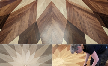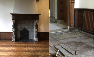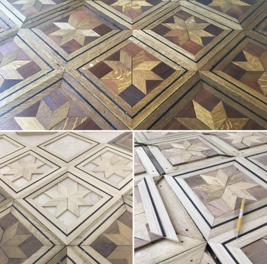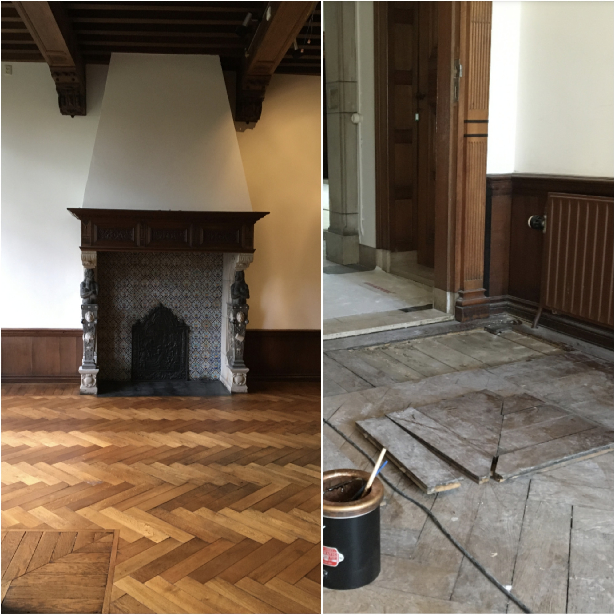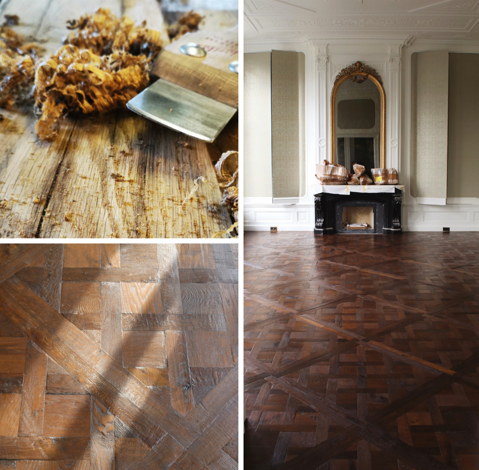 Open afbeelding in gallerijDe schuurmachine zet ik nooit in op historisch parket als deze van oudsher geconserveerd is met bijenwas. Hierbij is het mogelijk om zonder te schuren, en daarmee kostbaar hout af te nemen, het parket opnieuw op te halen en te laten uitkomen. -