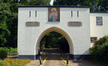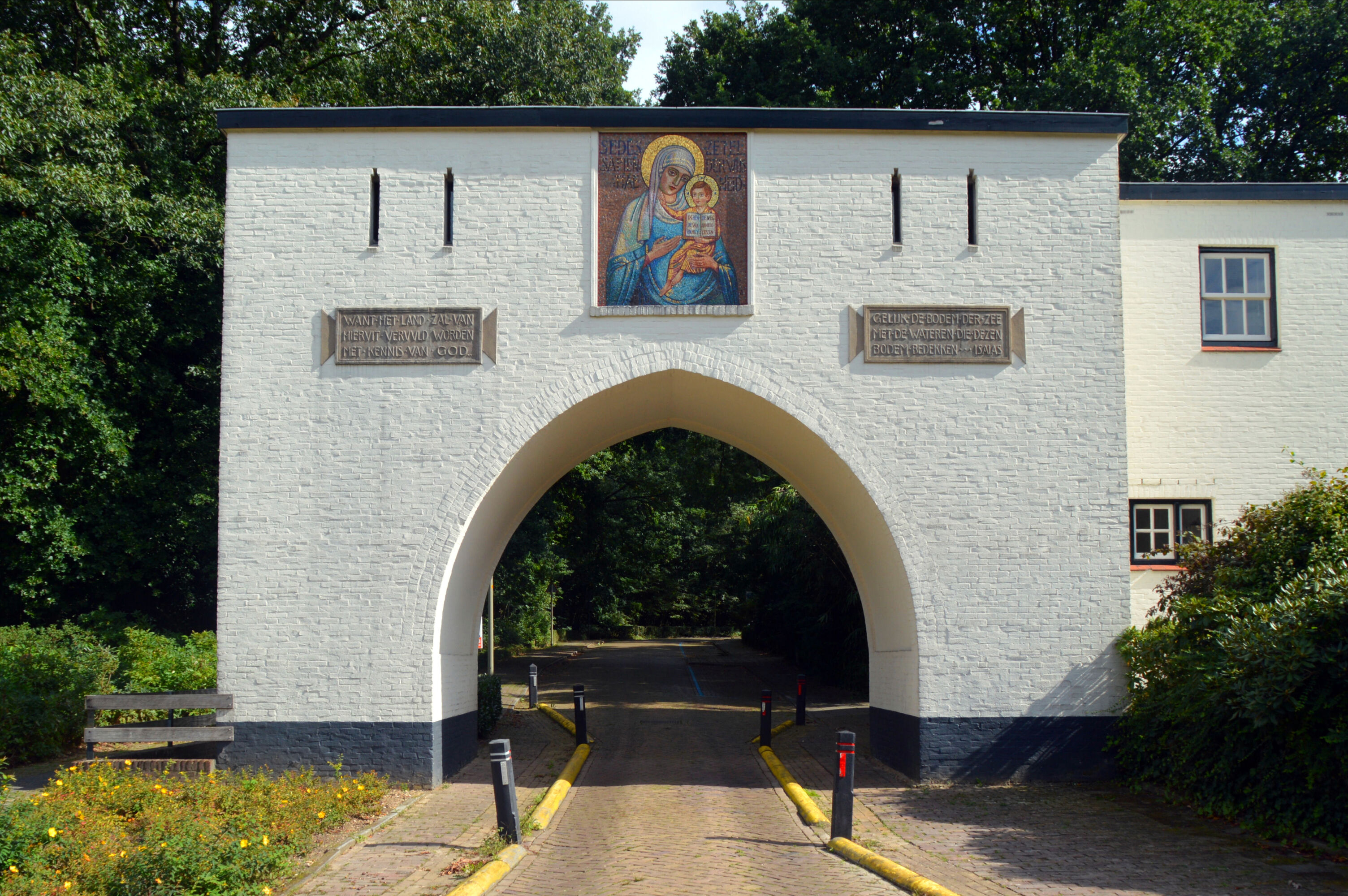 Open afbeelding in gallerijWoning met poort te Heilig-Landstichting, schadevrij reinigen van witte stucgevel, ornamenten en mozaïek met bladgoud. -