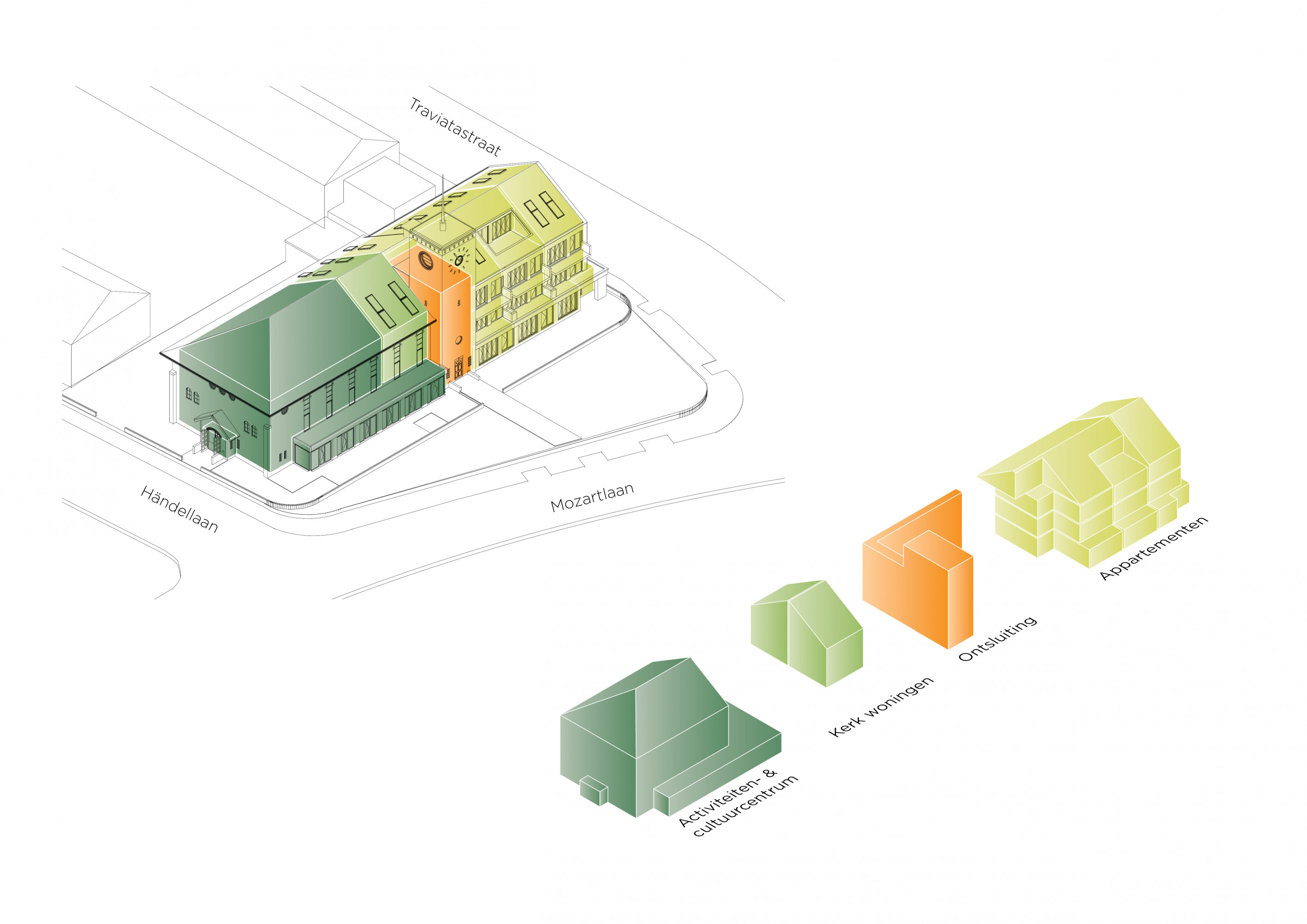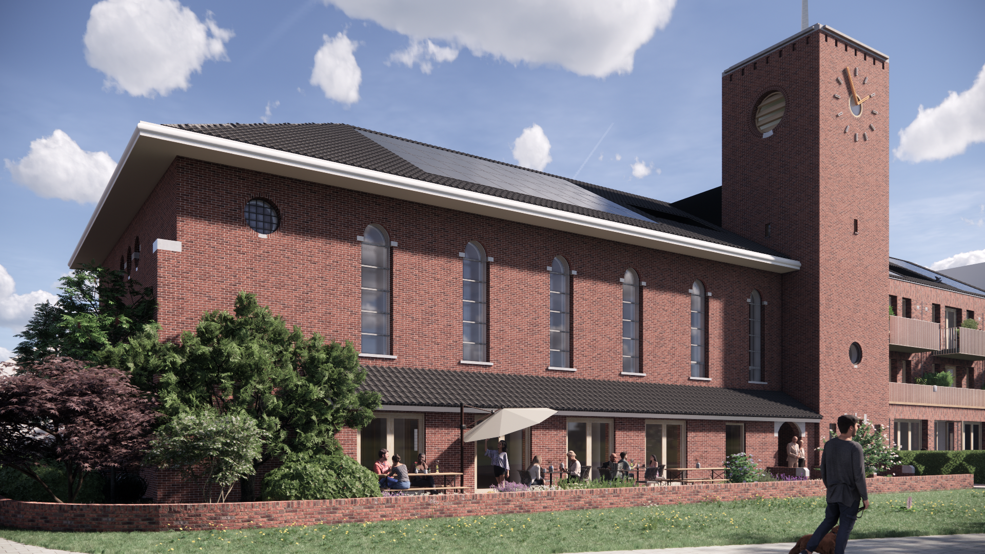 Open afbeelding in gallerijIn de Bethelkerk in Den Haag (Loosduinen) wordt de voormalige protestantse kerk getransformeerd tot (deels nieuwbouw) woningen en een cultureel centrum. -