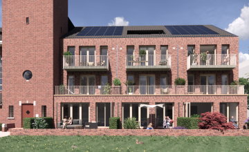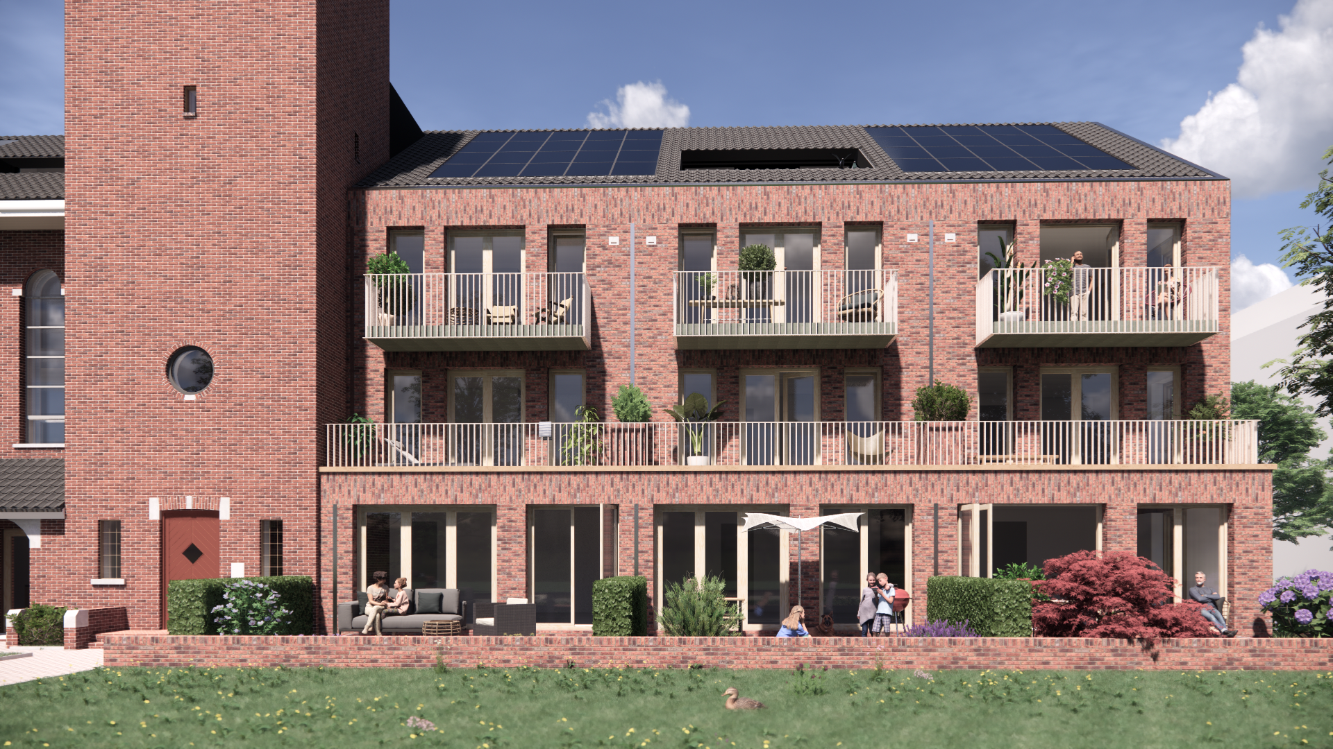 Open afbeelding in gallerijOp de plek van het oude buurtcentrum worden 10 nieuwbouw woningen gebouwd en in de kerk worden eveneens 2 woningen gerealiseerd. -