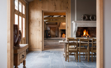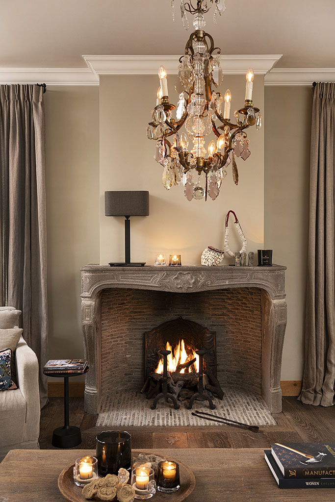 Open afbeelding in gallerijIn de woonkamer liggen massief verouderde eiken planken. De antieke 18e eeuwse handgekapte lavastenen schouw met haardaccessoires is hier dé blikvanger. Aan het plafond een antieke kroonluchter. -