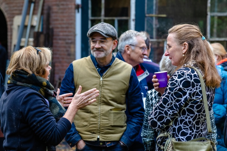 Nog voor de bijeenkomst officieel is begonnen, wordt er onderling door de community leden al druk gepraat. Ze zijn allemaal lid van het online platform, sommigen hebben elkaar al eens ontmoet op een eerdere bijeenkomst, anderen zijn voor er het eerst ‘live’ bij. Community leden Josan Meijers en Paul Otten wonen in een rijksmonumentale sluiswachterswoning in Tiel, onderdeel van de Hollandse Waterlinie. Josan vertelt enthousiast over het internationale bezoek dat ze onlangs ontvingen, in verband met de nominatie voor Unesco Werelderfgoed. ‘Wij zijn vaker bij de community bijeenkomsten geweest. Wij vinden het leuk om te zien welke oplossingen mensen kiezen bij de restauratie van hun monument.’ Paul vult aan: ‘Wij zullen ook aan de duurzaamheidsmaatregelen moeten, dus kijken wij met extra interesse naar de oplossingen die gekozen worden voor bijvoorbeeld ventilatie.’