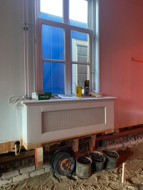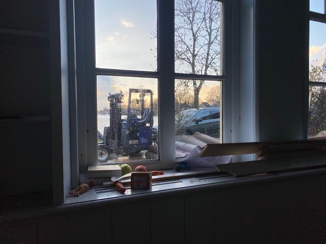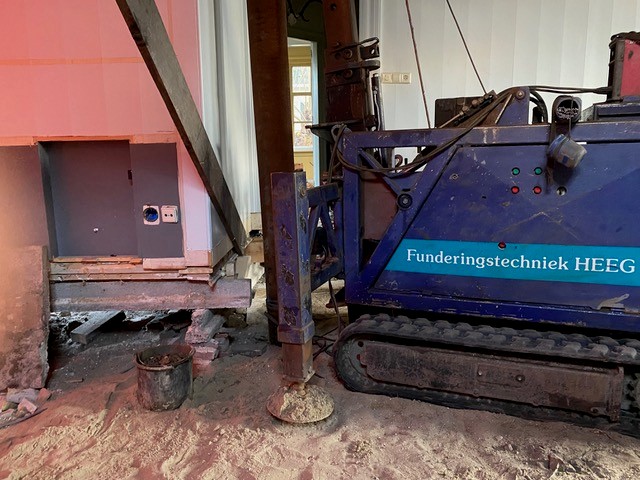 Inmiddels zijn de werkzaamheden begonnen. ‘Er worden onder ons huis 23 betonnen palen van elk 14,5 meter aangebracht. In holle buizen wordt beton gegoten. Daar komt dan weer een betonnen plaat op. Die wordt ‘ingekast’ in de oorspronkelijke funderingsvoet. Daarna brengen ze vloerverwarming aan. De wanden isoleren hebben we al eerder gedaan evenals het aanbrengen van isolerend monumentenglas.’ Dick is ondertussen blij dat ze doorgezet hebben. ‘De buren kijken met interesse naar wat wij aan het doen zijn. Je bent toch bang wanneer je aan het funderen slaat in een kwetsbare omgeving. Maar alles is gelukkig goed gegaan. Maar ik had het nooit gedaan als de regeling van het Restauratiefonds er niet was geweest. Het is anders niet te doen eigenlijk voor een particulier.’