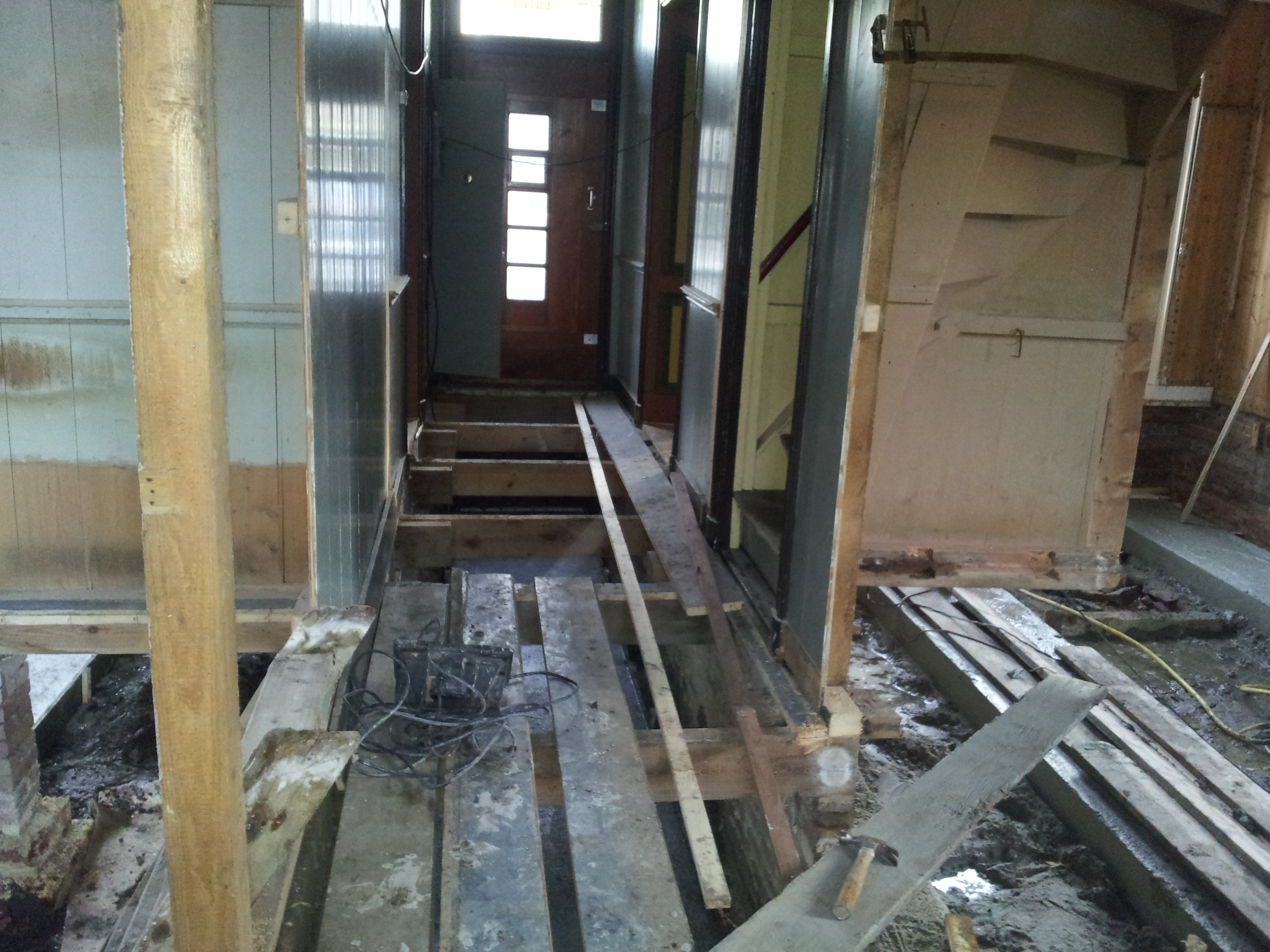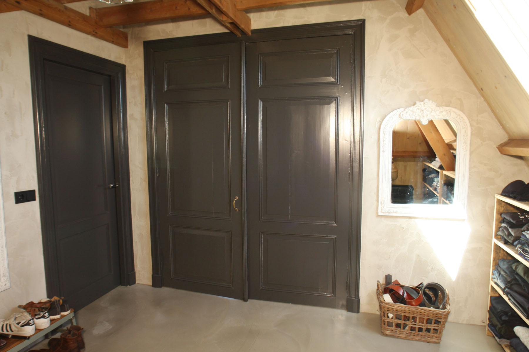 Er moest er een omvangrijke sloopklus geklaard worden. Paul vertelt: ‘Het was wel even schrikken hoor, toen we aan het werk gingen. De kozijnen waren slecht, de muren, het dak, de fundering, de schoorstenen: alles was slecht. Alleen het hout van de zolder en het frame van het dak was nog goed. De voorgevel hebben we deels opnieuw moeten opbouwen.’ Alle planken en vloerdelen die vrij kwamen, zijn door Paul opnieuw gebruikt. ‘Ook de planken langs de zijmuren hebben we hergebruikt. Het pand was goed geventileerd, waardoor het perfect licht hout was. We hebben al dat hout verwerkt in kledingkasten, een wc-meubel, een badkamermeubel etc. De hoge deuren uit de alkoof beneden, zijn boven gebruikt als tussendeuren van de slaapkamer naar de walk-in closet.’ Mary licht toe: ‘Door het hergebruik van materiaal bleef de oorspronkelijke sfeer goed bewaard.’
