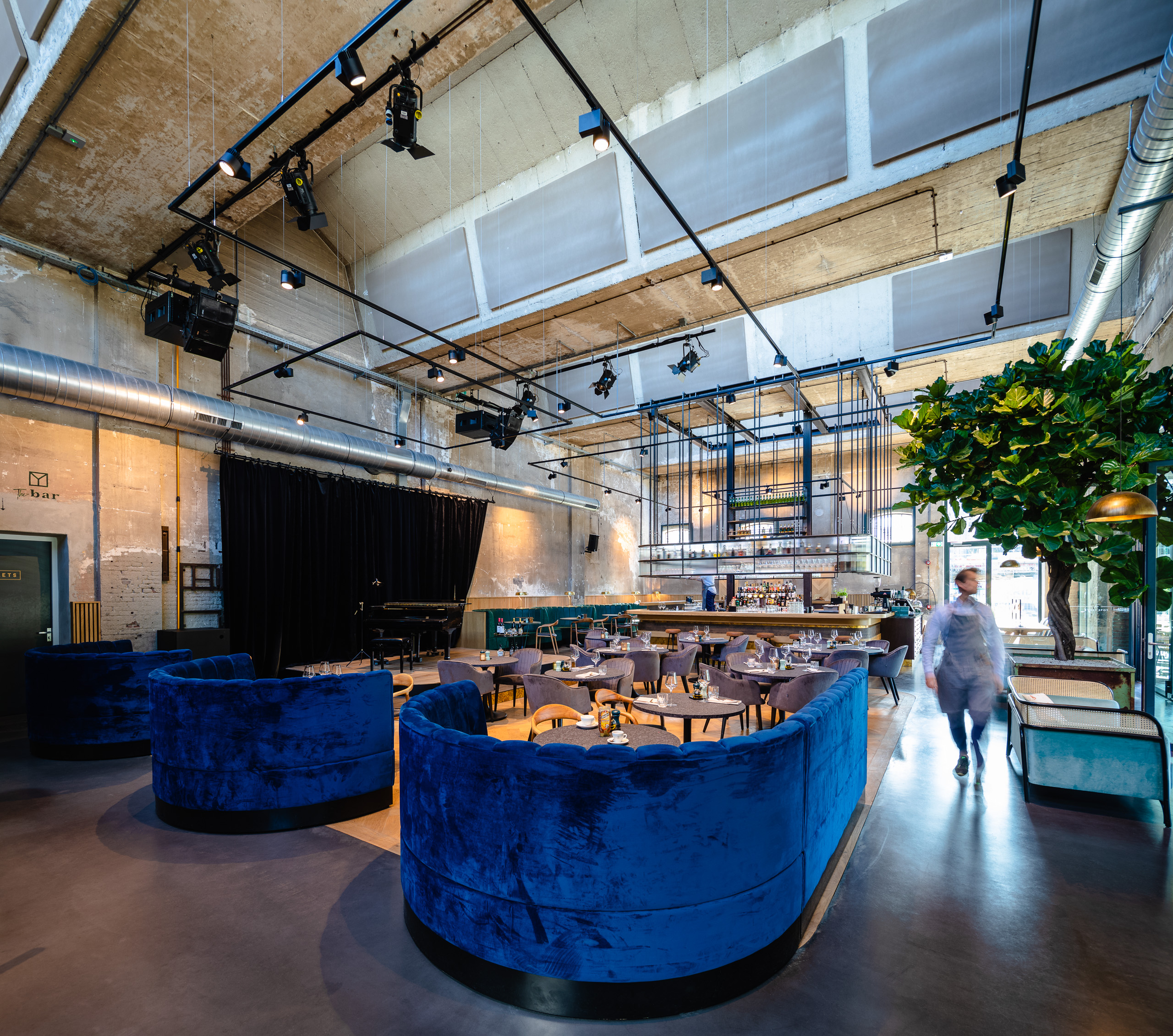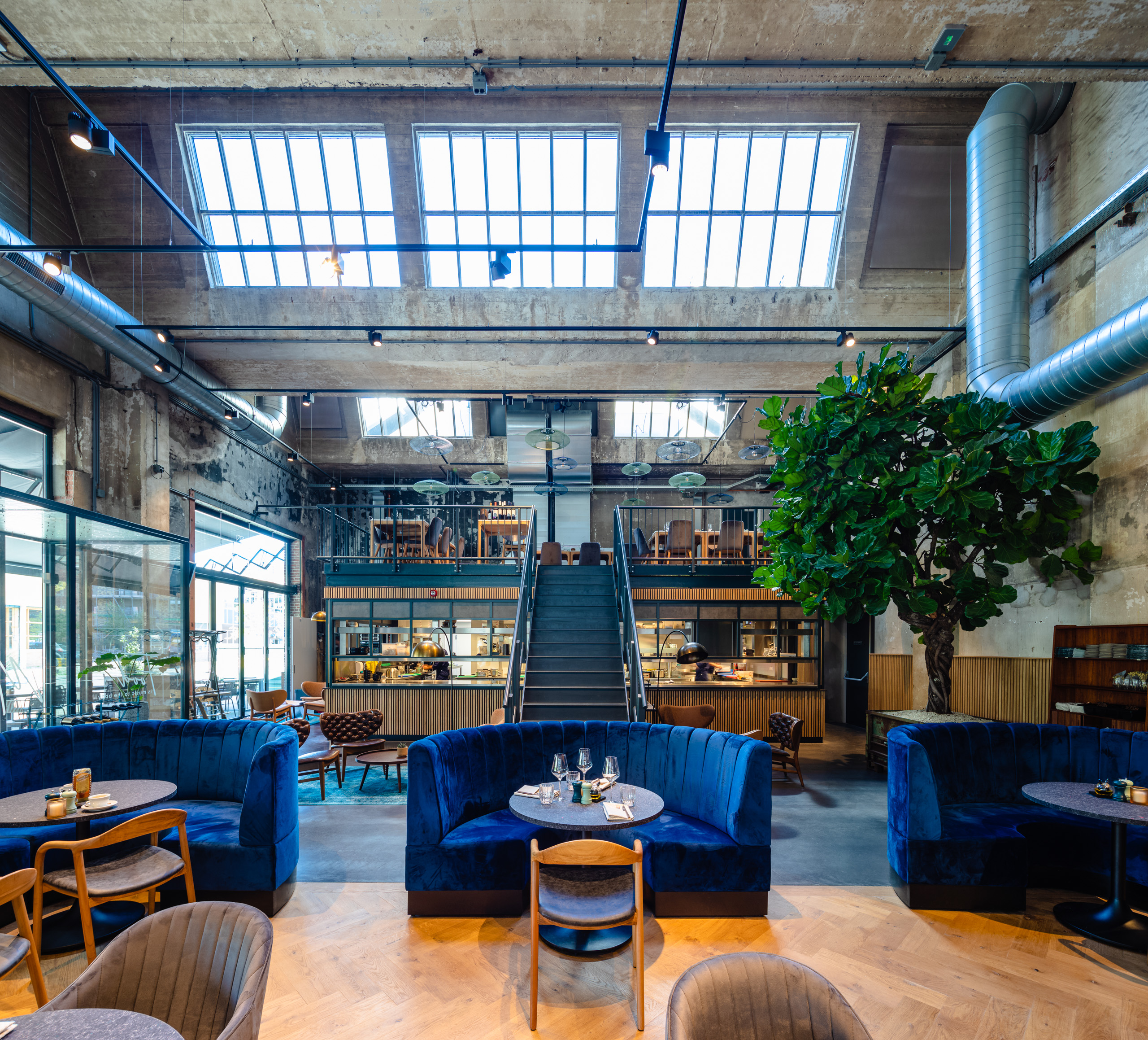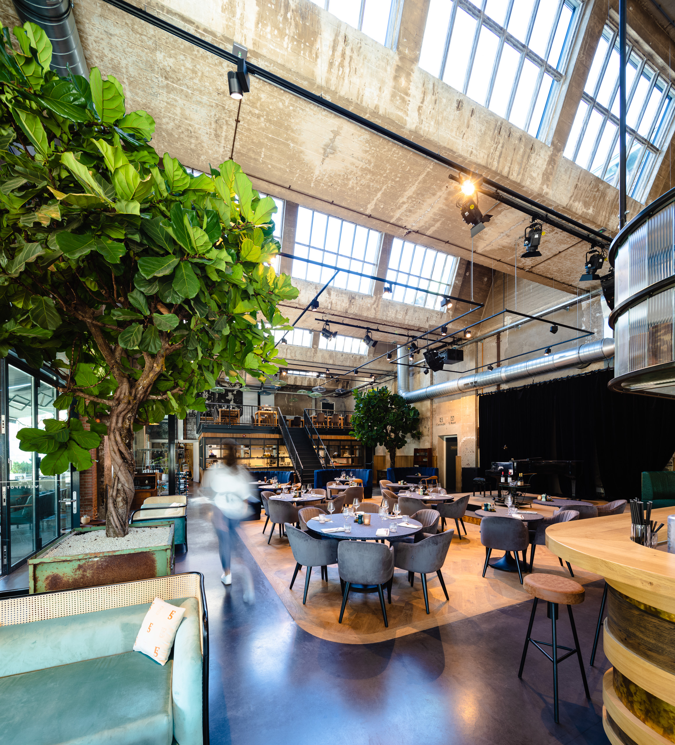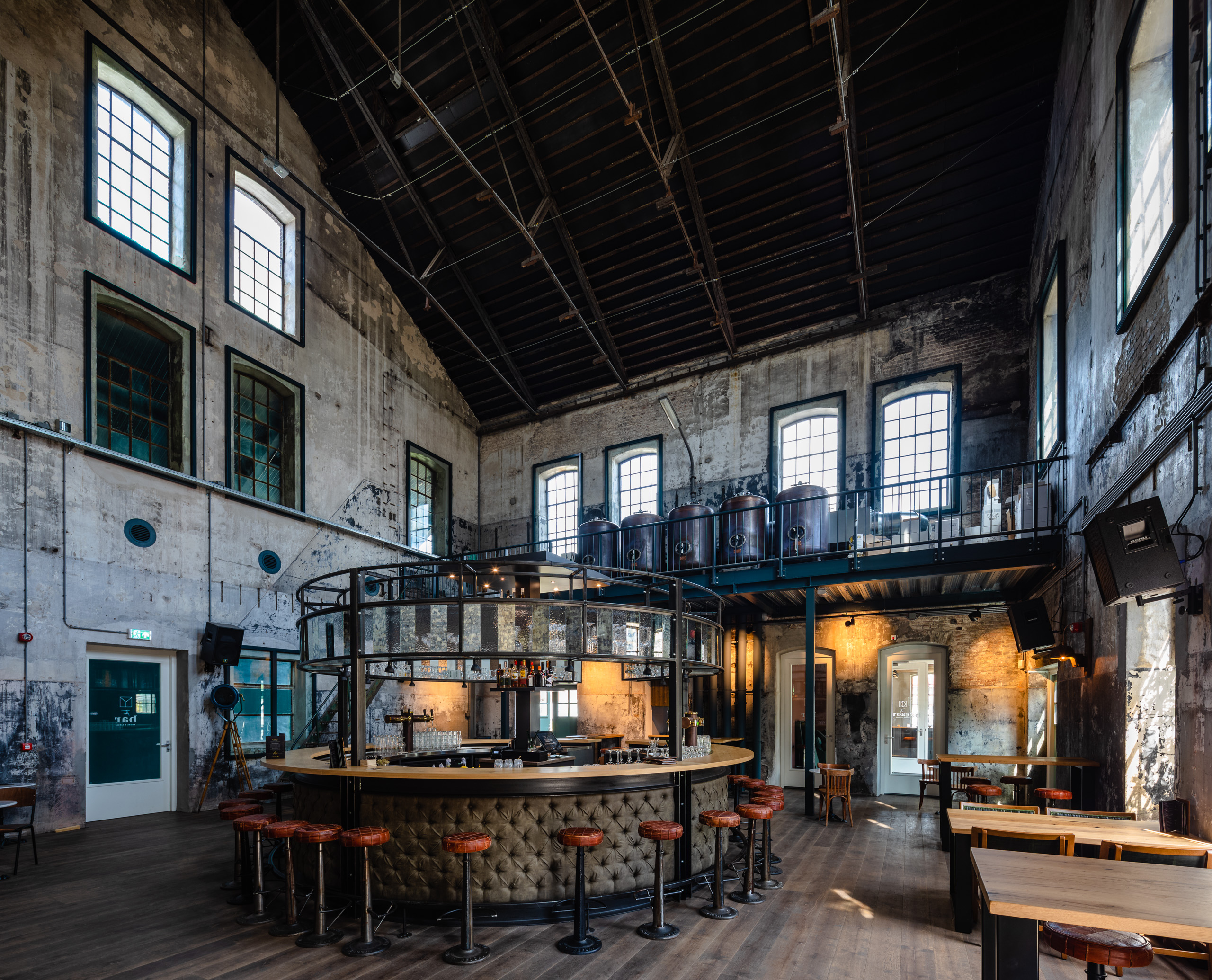 Opvallend vindt Malone ook de inrichting. ‘Het contrast tussen bijvoorbeeld de grove stenen muren met oude verflagen en de moderne fluwelen banken oogt heel gaaf.’ Toch ging het initiatiefnemer Van Stiphout bij de keuze voor het meubilair niet alleen om de ‘looks’; hij koos voor interieur van het Amsterdamse bedrijf PLANQ, mede vanwege hergebruik van materialen. ‘In de stoelen zijn oude uniforms van het leger verwerkt en in de grijze tafels kleding van ABN AMRO Bank. Dat we een oude fabriek omtoveren tot horecagelegenheid is duurzaam. Die vorm van duurzaamheid voeren we door in het nieuwe meubilair.’