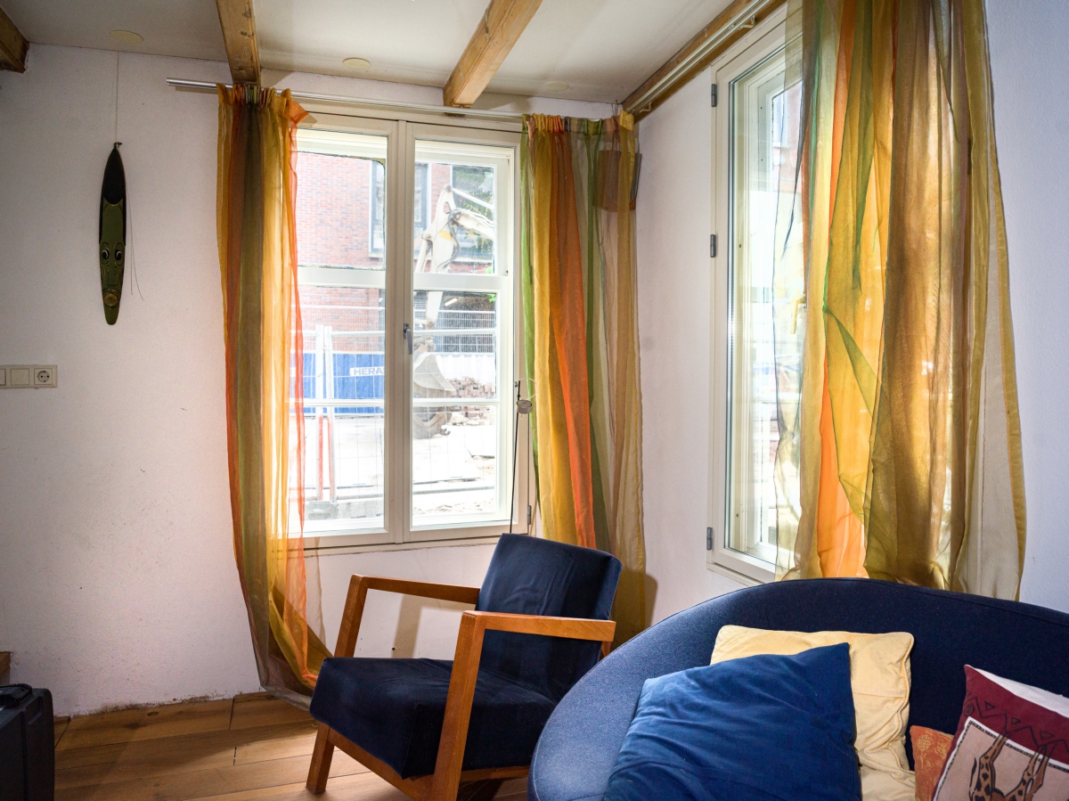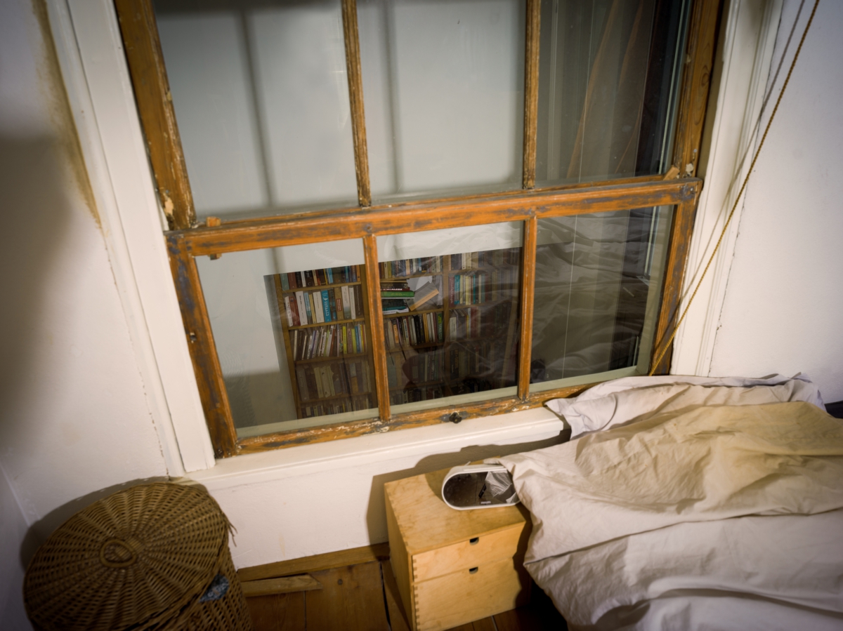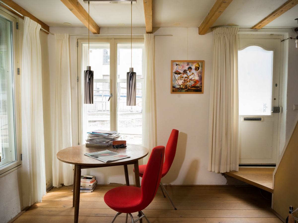 Het verval trad in toen er in de jaren negentig een Mercedes tegen de pui reed. Het was letterlijk en figuurlijk de genadeklap voor het huisje. ‘De eigenaren kregen geld van de verzekering om het te laten repareren, maar dat deden ze niet. Er ging een zeiltje over het huis om het binnen droog te houden. Door de jaren heen werd het zeil groter en groter. Op een gegeven moment had ik zelfs binnen plastic hangen, om het water dat ondanks de zeilen binnenkwam, op te vangen. Het was schimmelig, koud en vochtig in huis. Waarom ik er toch bleef wonen? Ik had voor 325 gulden per maand woonruimte in Amsterdam. En het was toen al een unieke plek.’