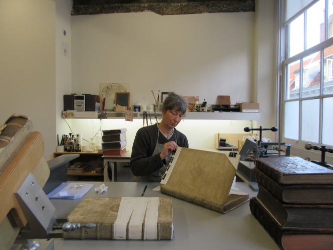 We hebben Eloy Koldeweij, de interieurdeskundige van de Rijksdienst, foto’s gestuurd. Hij was er heel enthousiast over, omdat dit een bijzonder monumentaal interieur aspect aan ons pand is. Het vraagt absoluut meer studie. Soms worden wij daarbij door het toeval geholpen. Voor de universiteit Tilburg kreeg ik een ‘Fondament’boeck’ te restaureren. Dat is een boek met kalligrafievoorbeelden van de schrijfmeester Jan van de Velde. Daarin stonden dezelfde sierletters als die wij op onze balken hebben. Dat is dan weer een stukje van de puzzel. Maar zolang we niet meer informatie hebben, laten we het zoals het nu is en komen we er niet aan. Doordat er zuur in het hout zit, zijn de letters zeer kwetsbaar. Als je er aan komt, vallen ze uit elkaar.’