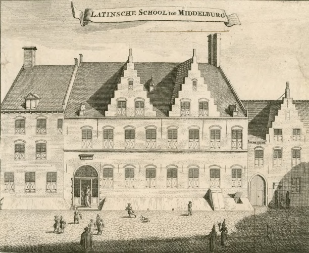Al in 1365 werd melding gemaakt van een school op deze plek in Middelburg. Het gebouw werd in de loop der tijd meerdere keren uitgebreid. Een pand dus met bouwsporen van eeuwen. Marijn de Valk en Jan Goedemé vinden het vanwege de ouderdom en geschiedenis een van de mooiste panden in Middelburg, maar ook omdat het zo mooi past bij hun werk als boekrestauratoren.
