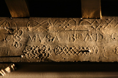 ‘Wij hebben ons atelier op de eerste verdieping, omdat wij met kostbare manuscripten werken. Naast alle andere veiligheidsmaatregelen is een werkplek op een verdieping veiliger. De kinderbalken daar hebben we inmiddels geschilderd, maar de moerbalken zijn nog in de oude tint grijs. Wij deden daar namelijk een bijzondere vondst: op de balken vonden wij uit papier of karton vervaardigde teksten. Omdat ze overgeschilderd zijn, kan je ze het beste met strijklicht waarnemen. Naar het nu lijkt zijn het Griekse en Latijnse toneelteksten, uit de late 16e eeuw. In het Grieks hebben we de tekst ‘ken u zelve’ kunnen ontcijferen en in het latijn lezen we ‘Musa Beata’, dat ‘de gelukzalige muze’ betekent.