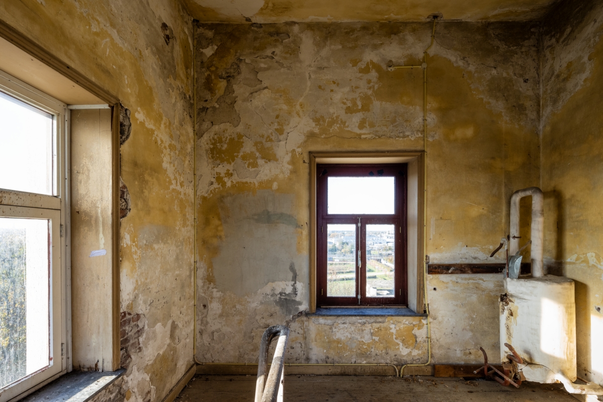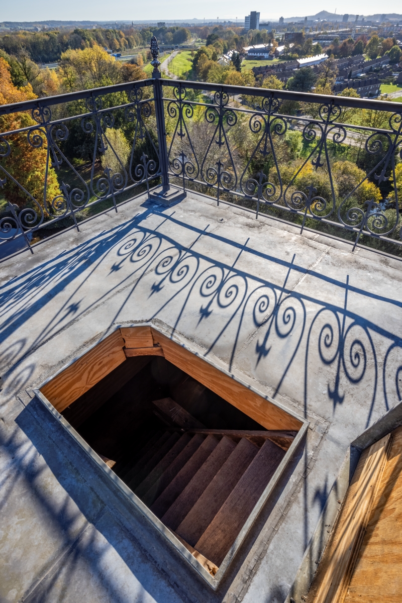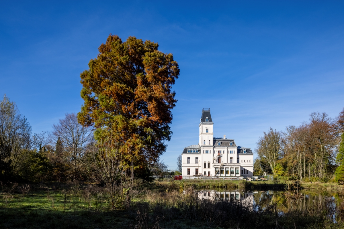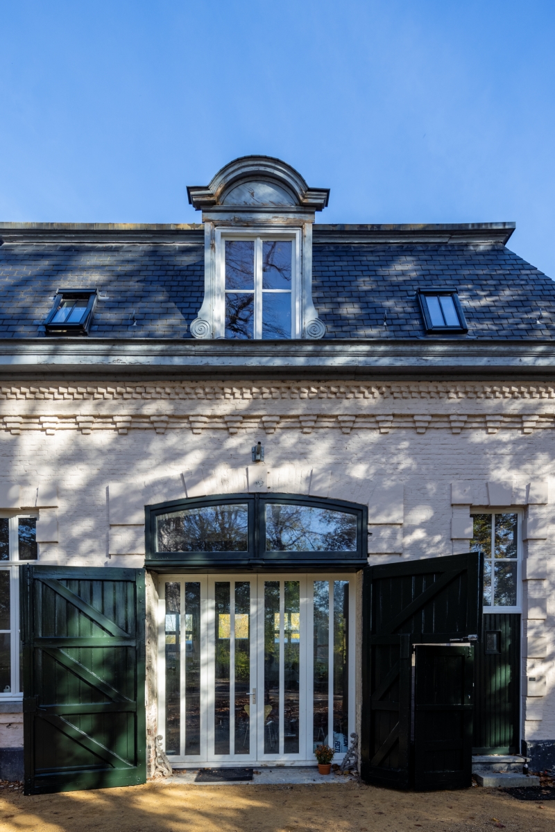 Gemeente Maastricht kocht Villa Kanjel, plus het bijbehorende koetshuis en landgoed in 2015 over van een zorginstelling. Daarna volgden jaren van leegstand, die werd opgelost met antikraak-bewoning. ‘Daar moesten we wel even doorheen kijken’, zegt Arends, terugblikkend op hun eerste bezichtiging. ‘Maar we zagen ook de ornamenten met engeltjes in de plafonds, de marmeren schouwen, de centrale hal die dankzij spiegelwanden eindeloos lijkt en het trappenhuis met enorme ramen die uitzicht geven op het park met monumentale bruggetjes’, vertelt ze. ‘De villa straalde ondanks de staat waarin ze verkeerde grandeur uit. En ik wist, wij kunnen hier wat van maken.’