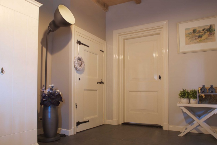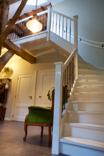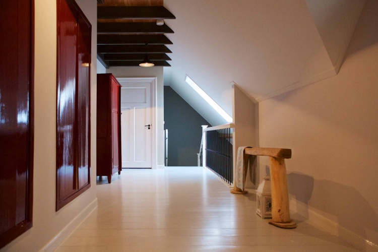 De aannemer deed de ruwbouw: op de bovenverdieping de plafonds, wanden en dakramen en verder nieuwe kozijnen en deuren. De afbouw hebben we zelf opgepakt. Ik ben erg blij met de open vide bij de hoofdentree. Je kan van beneden helemaal de kap in kijken, zo’n vijf meter hoog. De gebinten van de boerderij komen zo helemaal tot hun recht.’