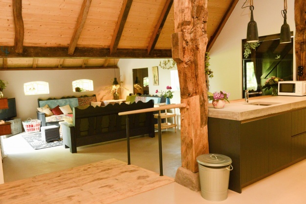 ‘Je ziet hier op het erf gebouwen uit verschillende periodes en dat zie je in het interieur terug. Bij de inrichting van de boerderijkamers heb ik oud en nieuw met elkaar gecombineerd. Het is nadrukkelijk niet de bedoeling dat het hier een museum wordt, tegelijkertijd hebben we er wel voor gezorgd dat het oude met zorg behandeld is. Daarbij heb ik ervoor gewaakt dat het niet oubollig werd. We hebben de materialen zorgvuldig gekozen. Je moet er vanuit gaan, dat je zo’n traject maar één keer doet, dan moet je het ook goed doen. We hadden de post ‘onvoorzien’ hoog gehouden, dat gaf ruimte om keuzes te maken en om in te spelen op onverwachte situaties, die zich bij een bestaand gebouw nu eenmaal altijd voordoen. En nu zijn we bijna klaar! De gebouwen zijn gedaan, de tuin is teruggebracht in de oorspronkelijke staat. Alleen het hooischuurtje bij de straat moet nog gerestaureerd worden, daar komt ook een boerderijkamer in. En dat is dan voorlopig het laatste.’