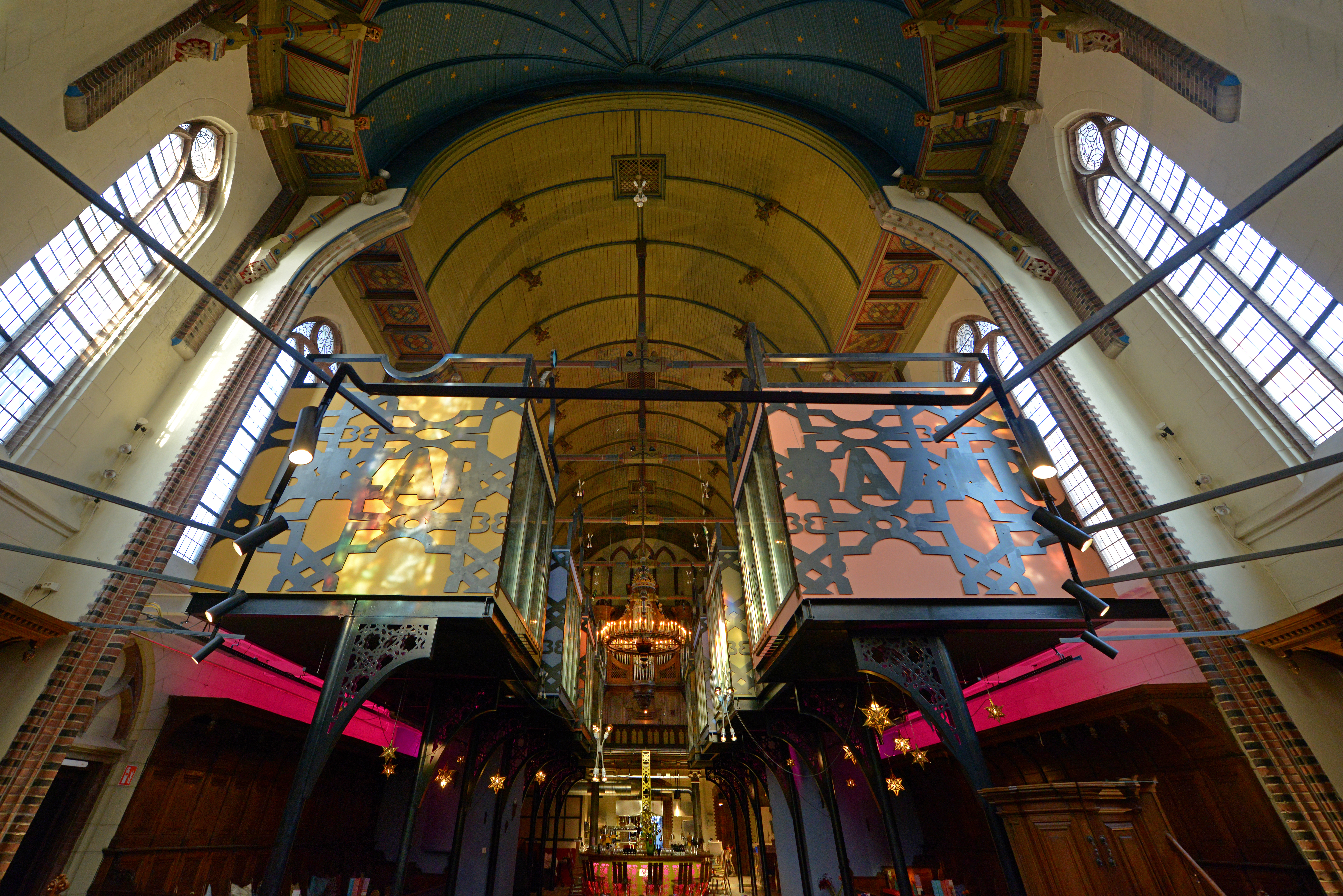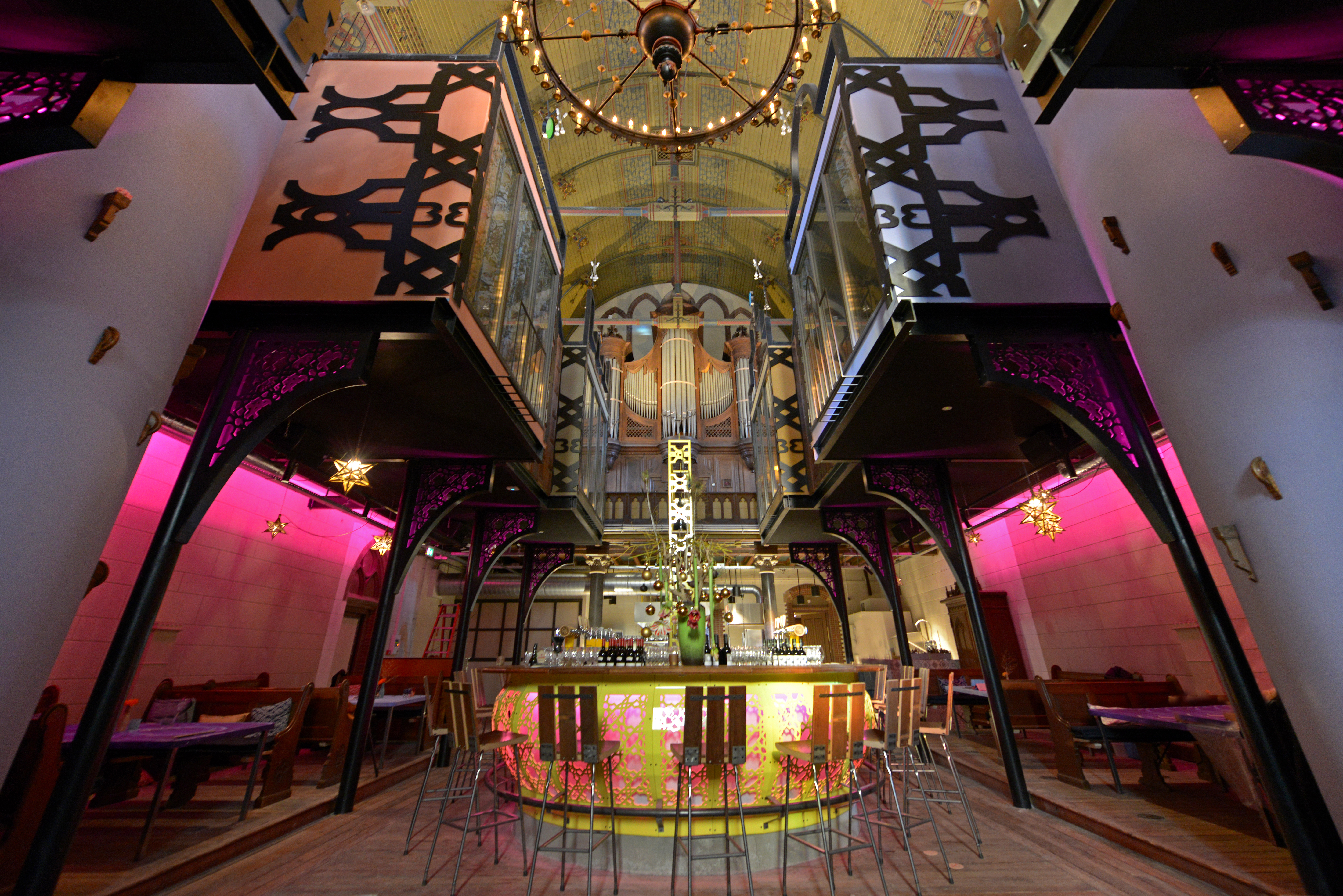 Zo bescheiden als de entree is, zo overweldigend is het interieur. Hip en historisch versterken elkaar. Het knalgele staal van de bar vormt een spetterende combinatie met de zilverkleurige pijpen van het monumentale orgel. En de gouden sterren die al sinds 1879 op het plafond van de kerk prijken, krijgen een tweede leven in het schijnsel van de splinternieuwe roze ledverlichting. Gasten weten niet waar ze naar moeten kijken; naar de kleurrijke entourage, naar de bereiding van goddelijke gerechten in de open keuken onder het reusachtige orgel of naar de in de bazaar uitgestalde exotische koopwaar. De unieke vormen van beleving strijden continu om de aandacht van de gasten.