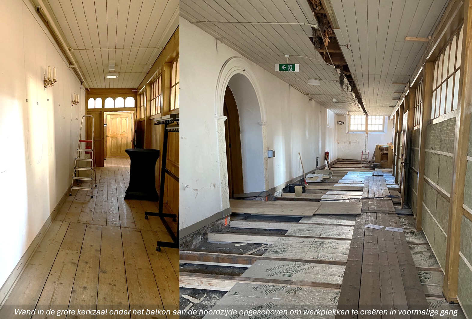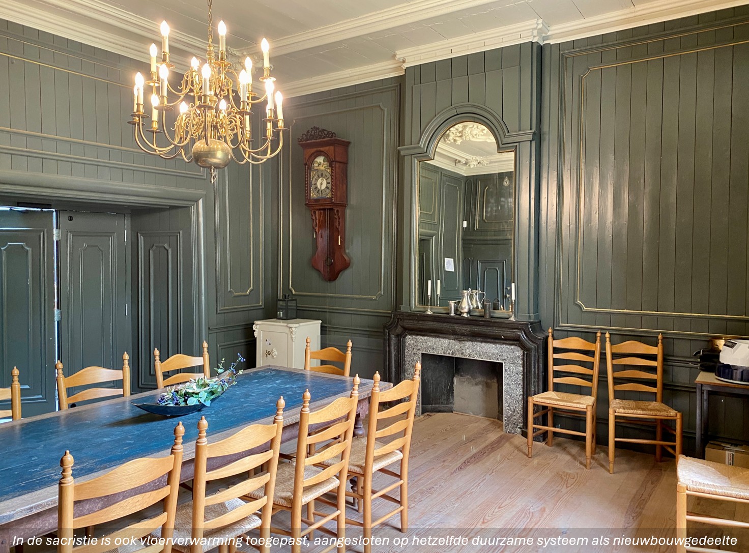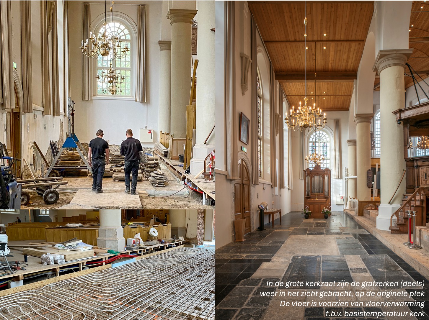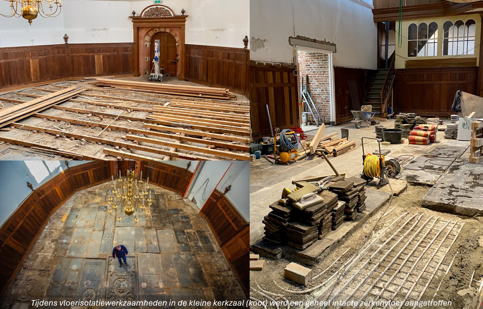 Tijdens isolatiewerkzaamheden in de kleine kerkzaal werden we aangenaam verrast door een volledig intacte eeuwenoude zerkenvloer onder de houten vloer. Na extra fondsenwerving hebben we deze in het zicht kunnen brengen én tevens hoge isolatiewaarden kunnen realiseren.