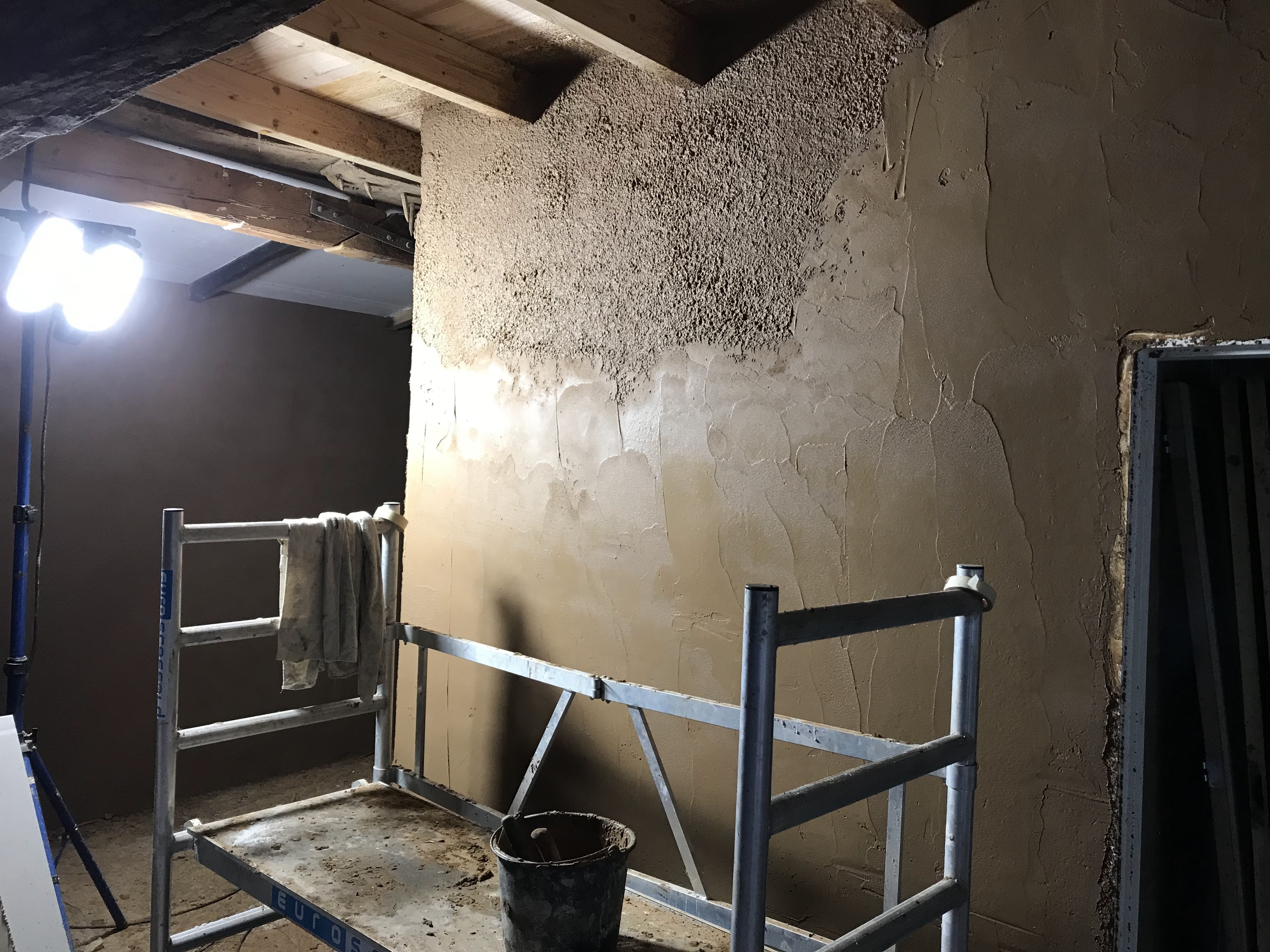 Geen folie dus, maar leem voor het huis in Erm. Marjan: ‘In Emmen zit leem in de grond. Bij Oskam B.V., een leemverwerkingsbedrijf, kochten we 25000 kilo leem en leemstenen. Een professional in Duitsland heeft Andy voorgedaan hoe je die lemen muren opzet.’ Andy: ‘Dat moet laag voor laag. De eerste laag is een lemen laag van 1 cm om de muur te egaliseren. Daarbovenop komen houtvezelplaten van 10 cm dik, die ademen en isoleren goed. Op die houtvezelplaten kwamen de leidingen van de verwarming. En vervolgens ging ik daar weer met lagen leem overheen. Dat doe je laag voor laag en je moet het tussendoor goed laten drogen. De onderste laag leem is gemengd met stro. In de bovenste lagen is een gaas verwerkt, dat zorgt ervoor dat de spanning niet te groot wordt en het leem niet gaat barsten.’